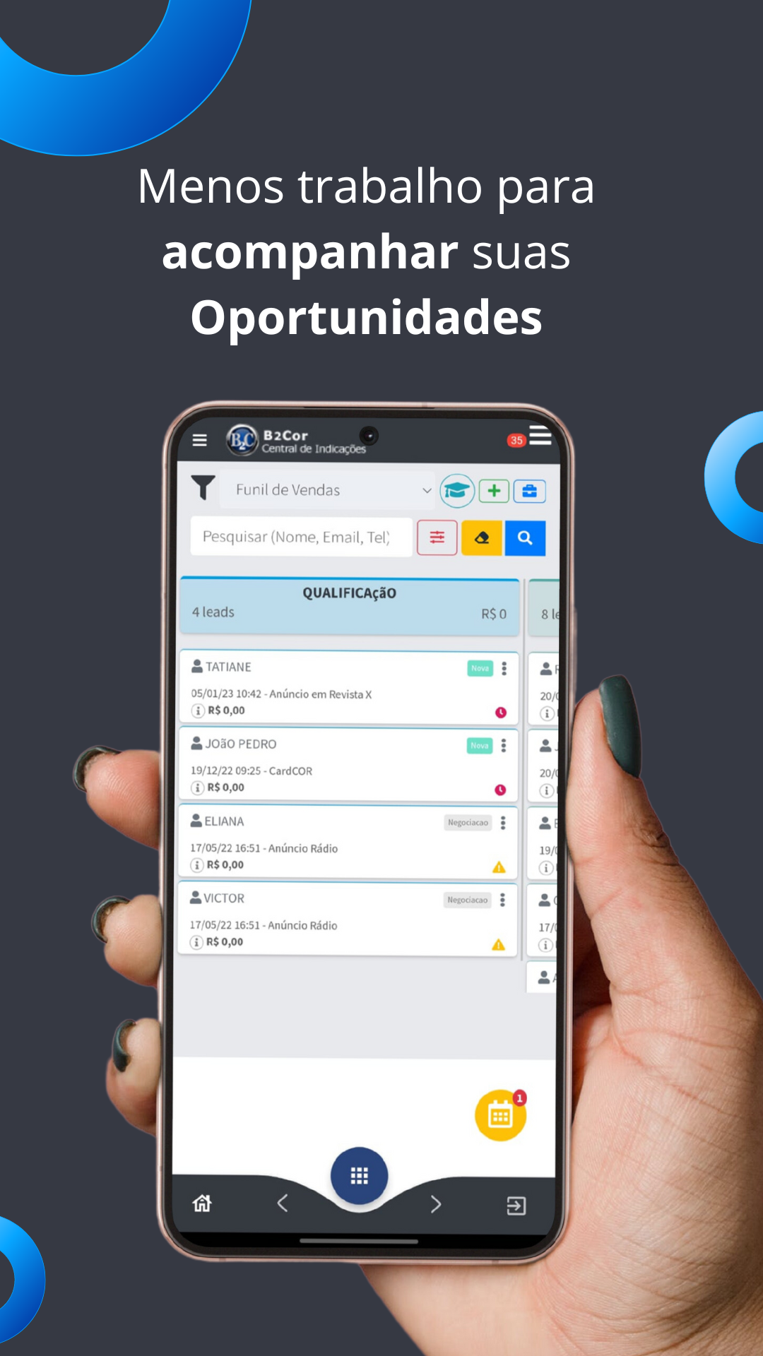 Este aplicativo funciona em conjunto com B2Cor CRM online para Corretores de Saúde e Seguros (Central de Indicações), e é voltado para corretores e corretoras que desejam ter mais mobilidade, agilidade e rapidez. Trata-se de uma poderosa ferramenta, que ajuda os profissionais e corretoras deste setor a organizar e agilizar as suas vendas. Com este aplicativo, você receberá notificações instantâneas ao receber novas indicações, compromissos da agenda, novos recados e avisos gerais.